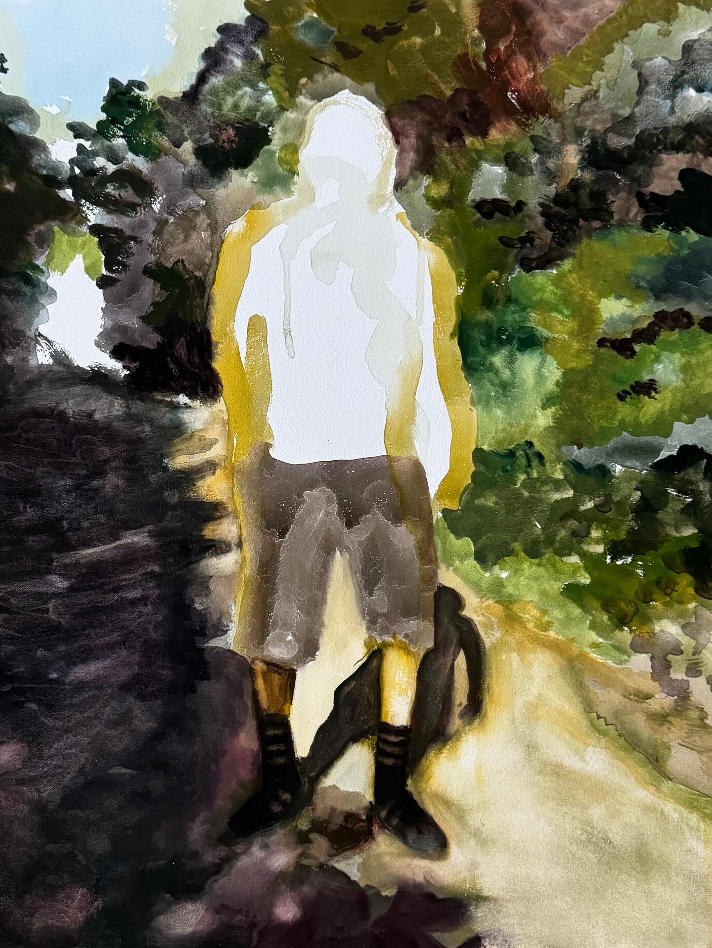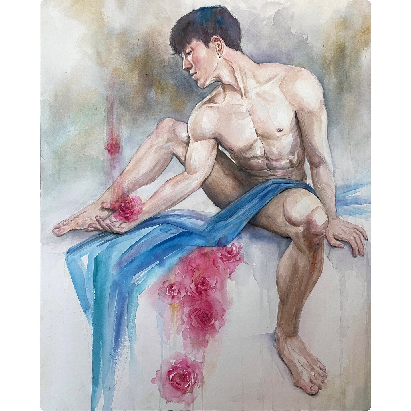 ファンアートをきっかけに人体表現に惹かれ、男性ヌードのクロッキーを続けてきた。生身の人物を描くときの緊張感と高揚を基盤としながら、最近はクロッキーから更に踏み込んだ表現を探っている。今回の展示は「初恋」が主題であるが、世間で語られるような楽しく甘いイメージには違和感があり、自分にとってそれは苛立ちや反骨心、焦燥、孤独を伴う複雑な感情の記憶である。