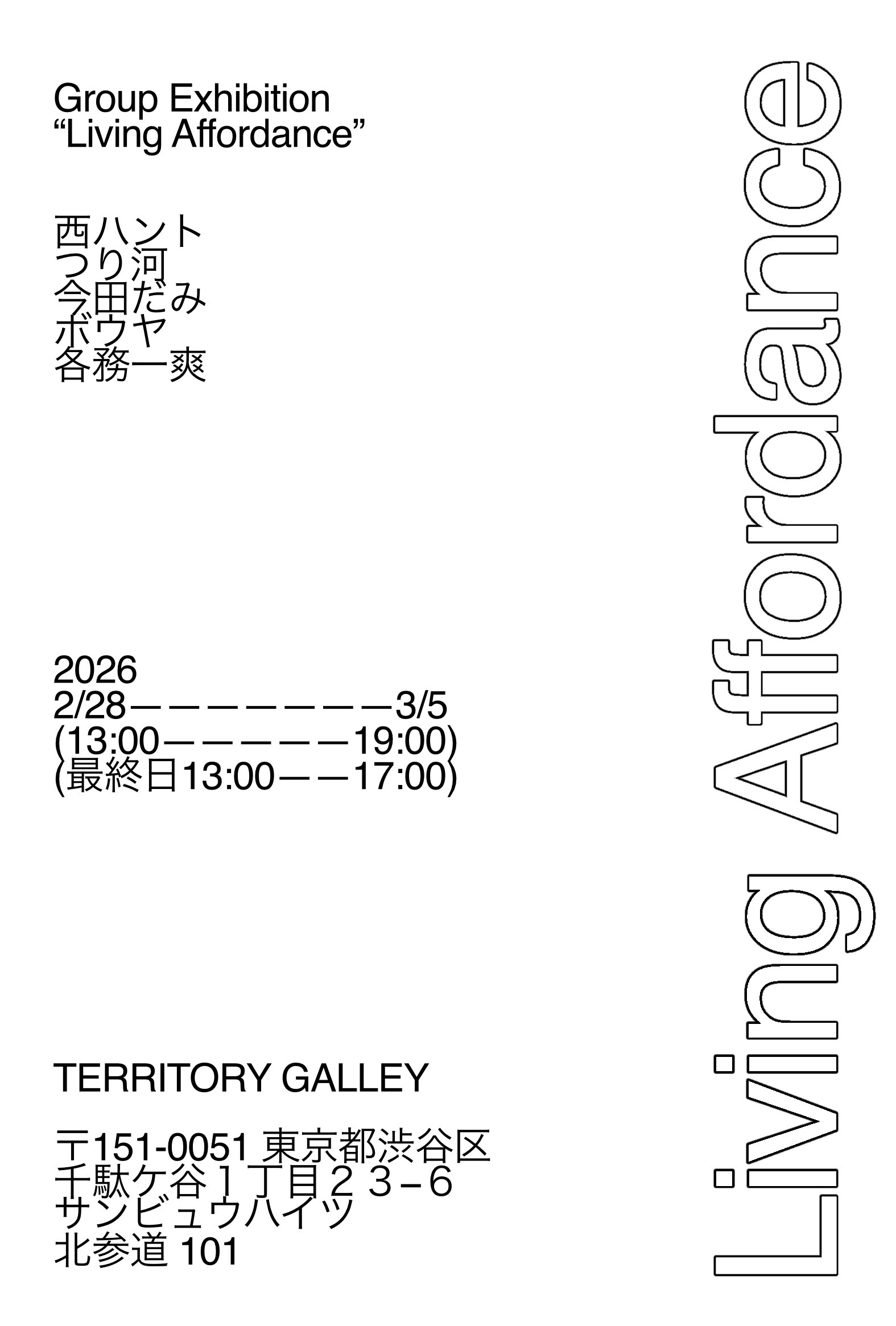 西ハント / つり 河 / 今田だみ / ボウヤ / 各務一爽 Group Exhibition「Living Affordance」